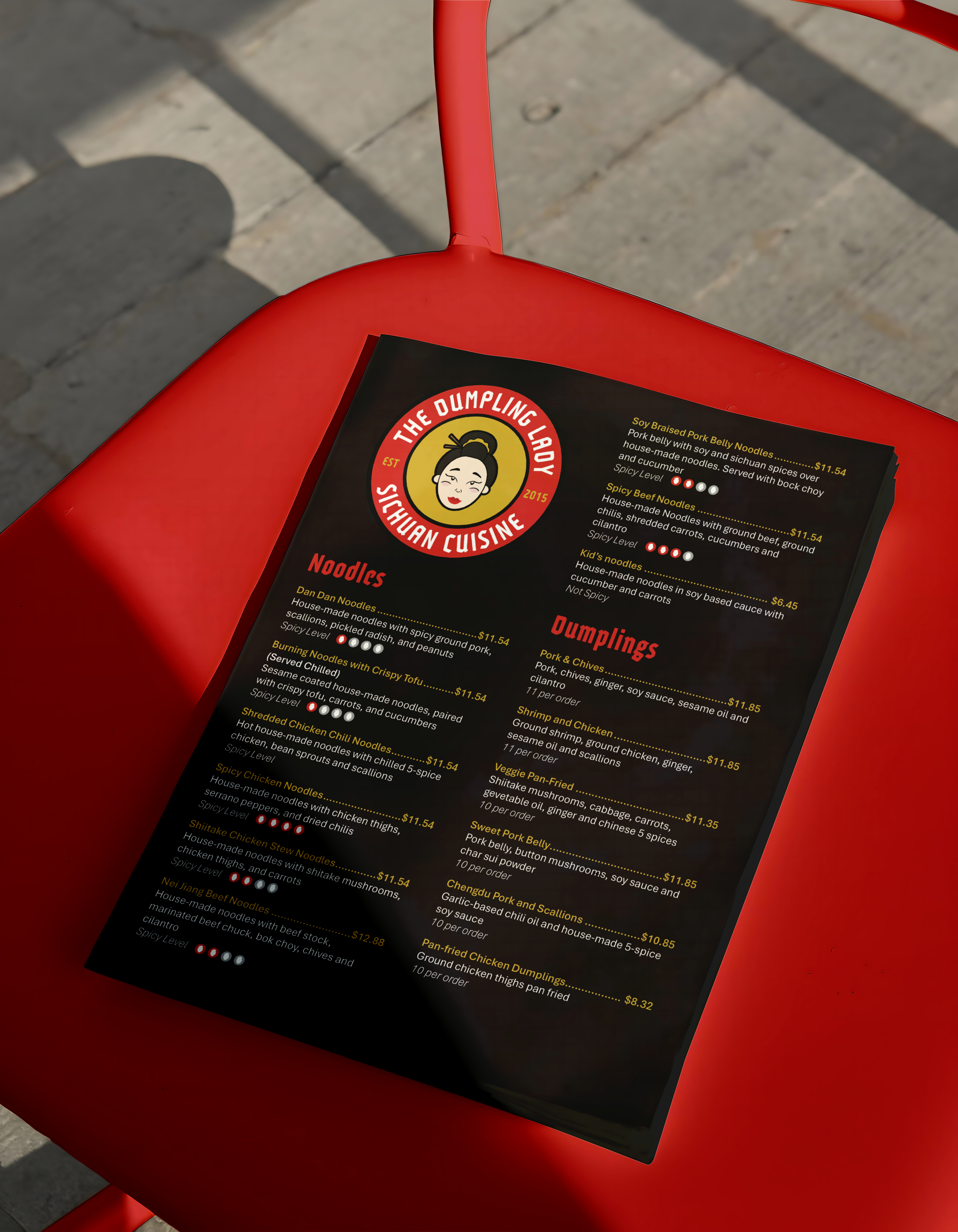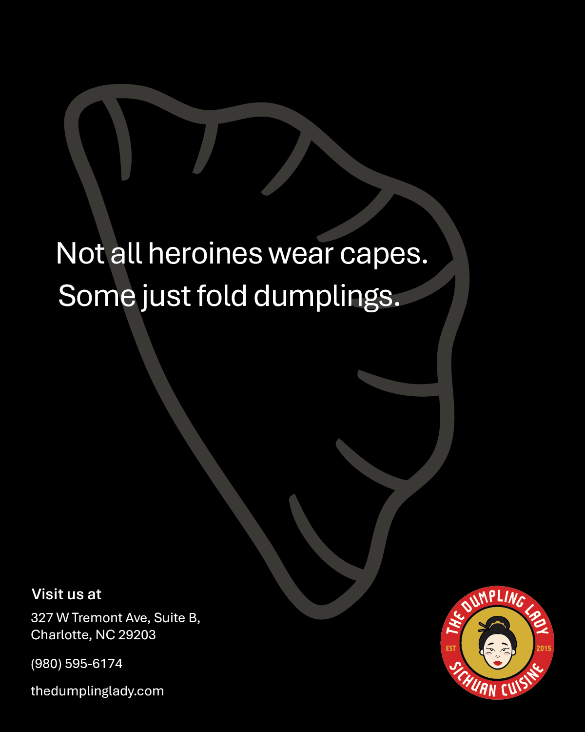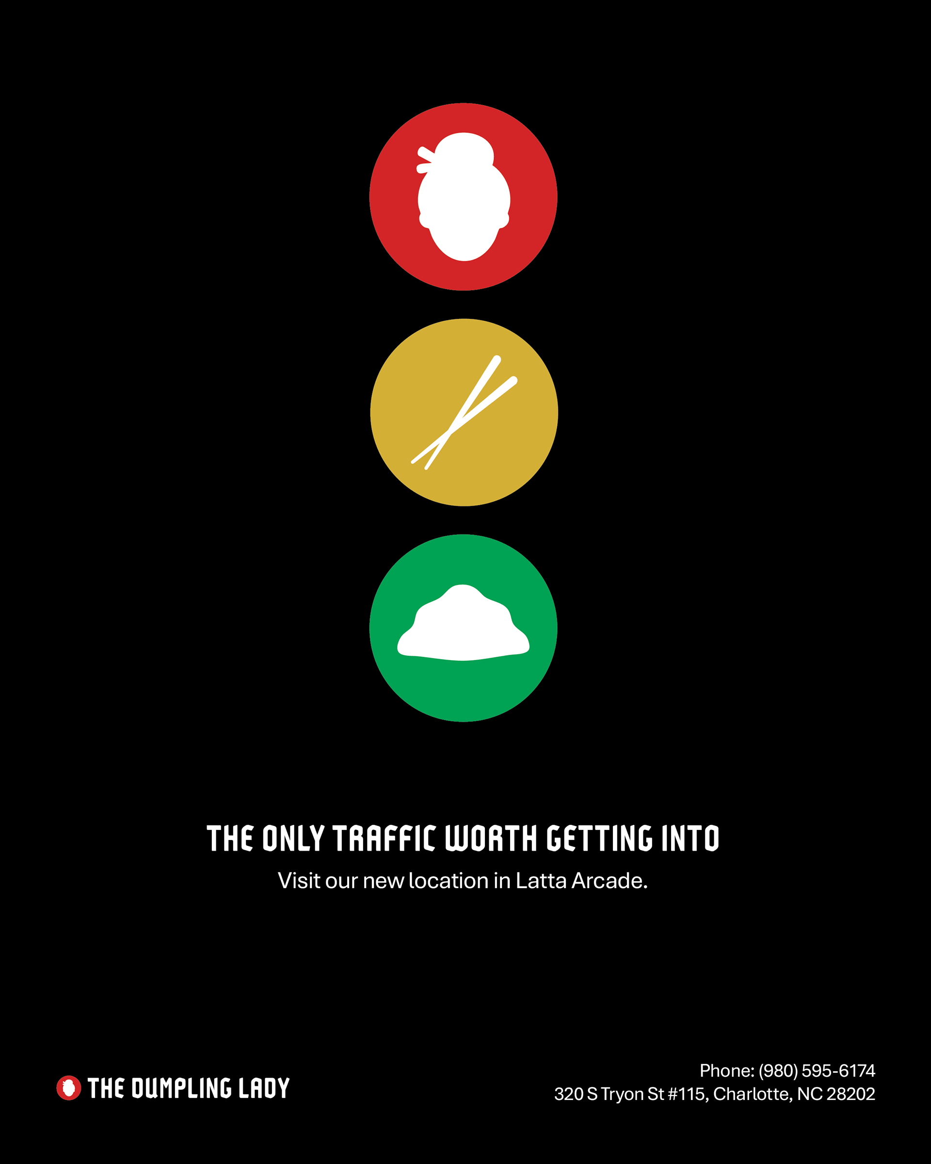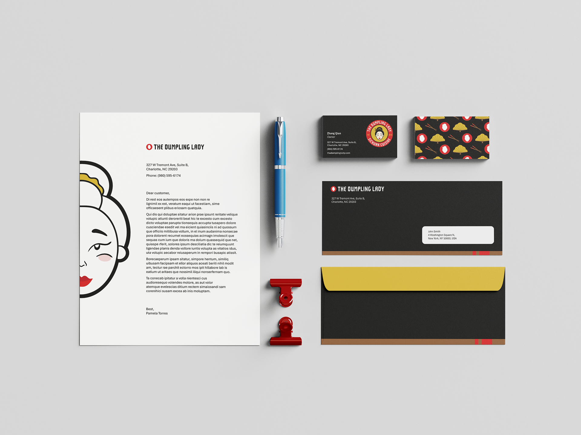 Logo, stationery, ads, and menu for local Charlotte restaurant, The Dumpling Lady.